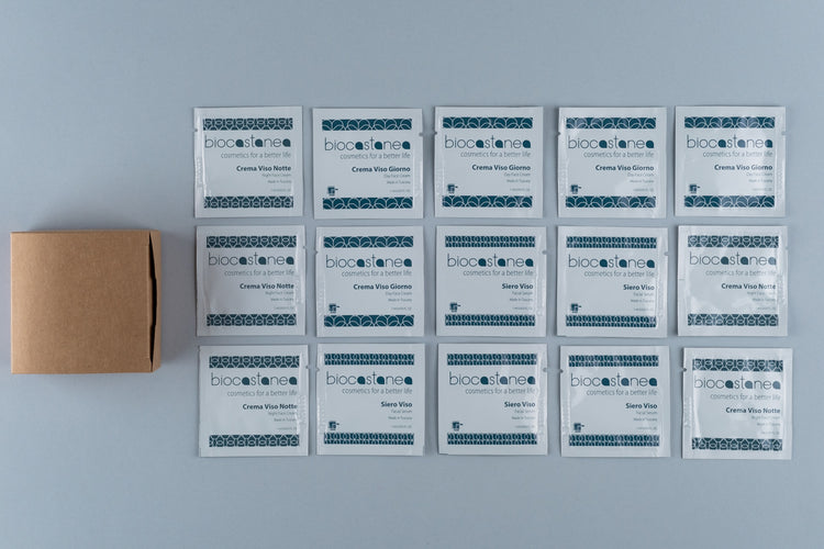 - mini box: 15 monodose (5 siero, 5 crema viso giorno, 5 crema viso notte)