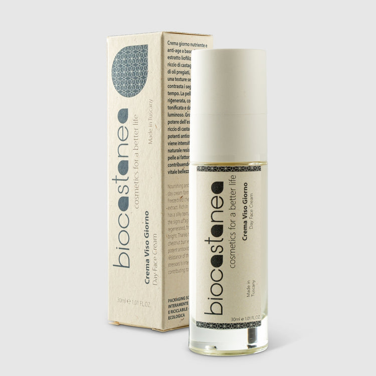 Nourishing and anti-age Day Cream with bi oactive chestnut burr extract. Rich of precious oils, with a silky texture, the Day Cream fights the signs of aging. The extract from chestnut burr provides a strong protection against oxidative stress, like that caused by UV rays or pollution, preventing cellular damage and favoring the production of collagen and recovery of viability. The face skin is thus regenerated, compact, tonic, luminous.