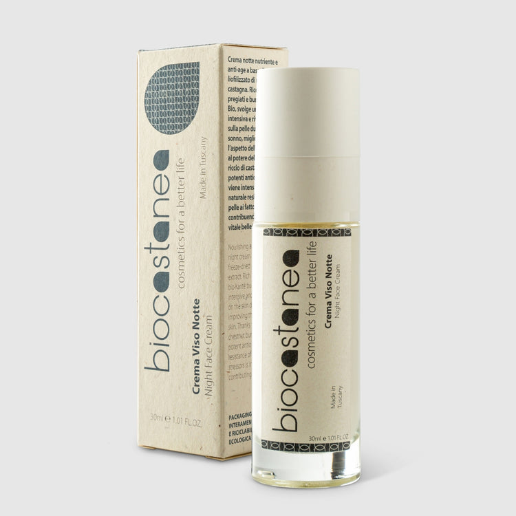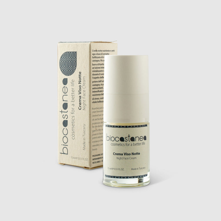 Nourishing anod anti-age Night Cream with biactive chestnut burr extract. Rich of precious oils and Karite butter, the Night Cream plays an intensive and revitalizing action on the skin during the sleep, improving the cutis look. During the night, the extract from chestnut burr acts in depth allowing the recovery of skin cells viability and continuing collagen production.
